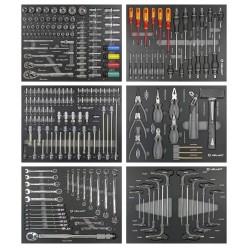 This version of 8 drawer tool chest from VELUNT comes with a wide range of high quality tools (wrench sockets, spanners, screwdrivers, pliers and much more). No matter whether for your hobby room, workshop or garage, this tool cabinet is a perfect solution. Thanks to the integrated lock, 8 drawers can be locked at once which prevents the drawers from opening accidentally when the chest is being moved. The robust countertop on the tool trolley will be a great spot to keep frequently used tools within reach. Double panelled walls, body reinforcement and ball-bearing drawer slides for smooth action.